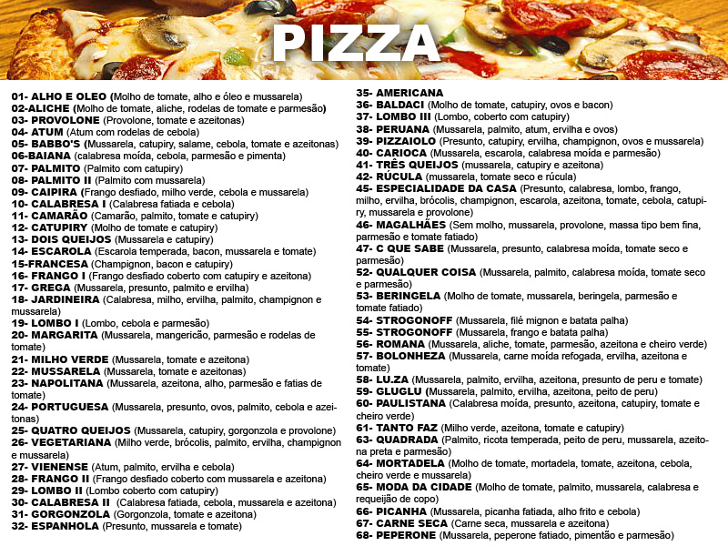 27 - Portuguesa : Molho de tomate,presunto,ervilha,palmito,cebola,mussarela,ovo,tomate,orégano e azeitonas.